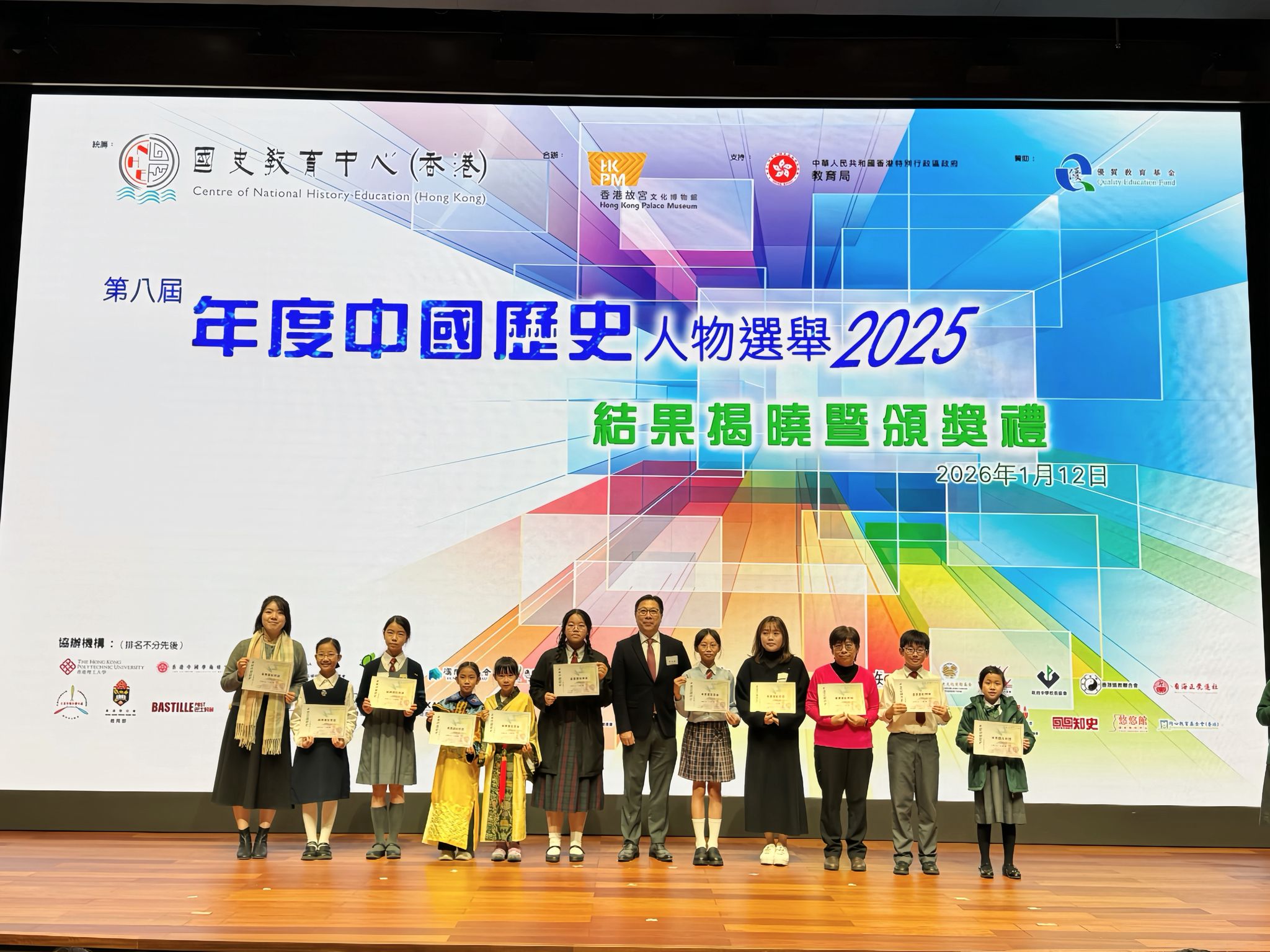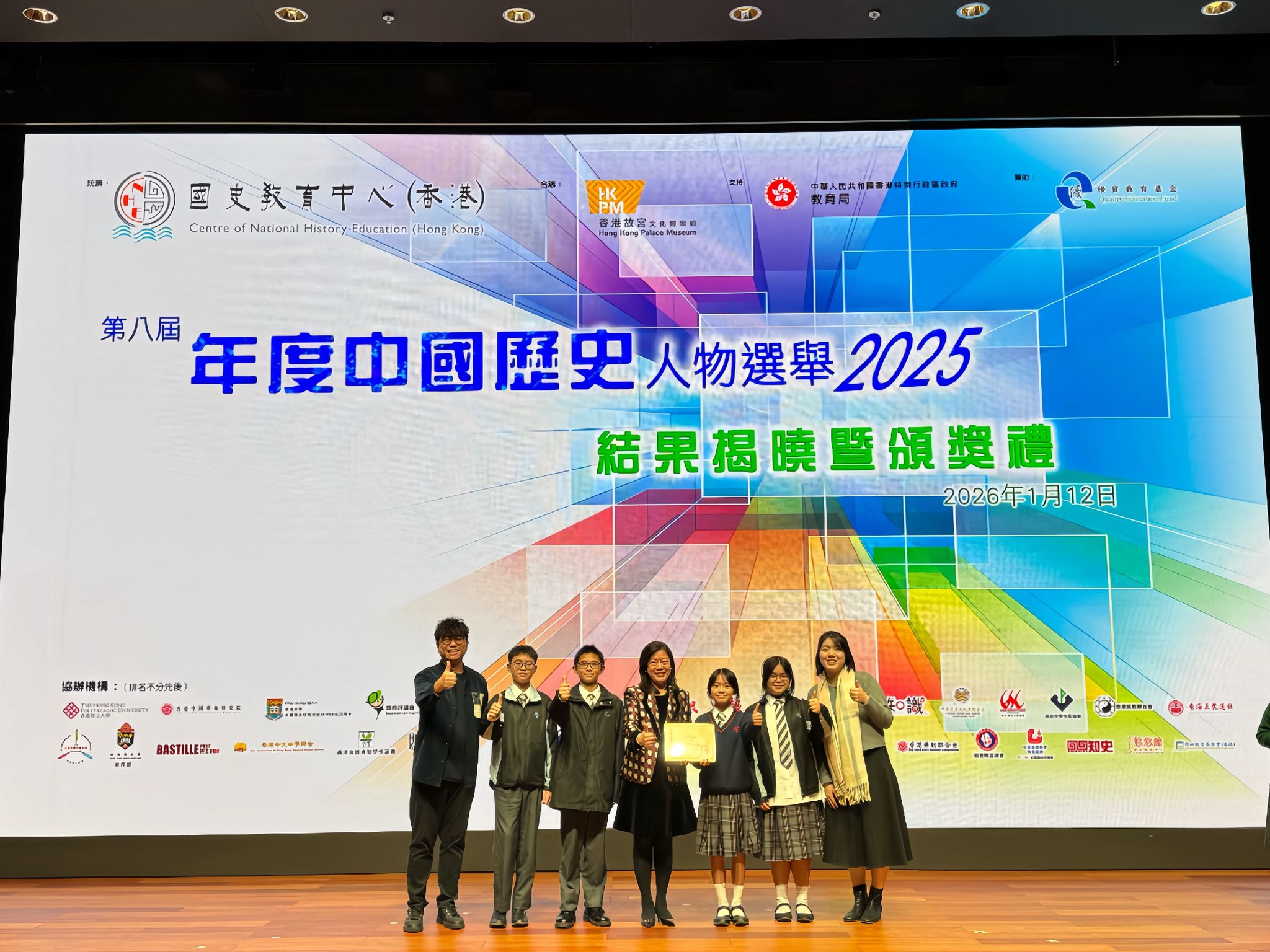 2026年01月12日 第八屆「年度中國歷史人物選舉」 12 1 月, 2026 ewunadmin 得獎快訊 「最高票數獎」 第八屆「年度中國歷史人物選舉」以「時代精神,變革為民」為題,活動由國史教育中心舉辦,讓超過460間中小學的師生和家長投票。本校的選票數目在中學組為全港第一,教育局常任秘書長陳穎韶女士,JP親自頒發「最高票數獎」,表示候選歷史人物均生於盛世或變局之中,但仍以安國為民的精神,及積極革新的意志迎難而上,希望學生能透過選舉深切感悟堅定的報國抱負和愛國情懷。賽果見證了怡文中學對國家歷史的熱切關注。